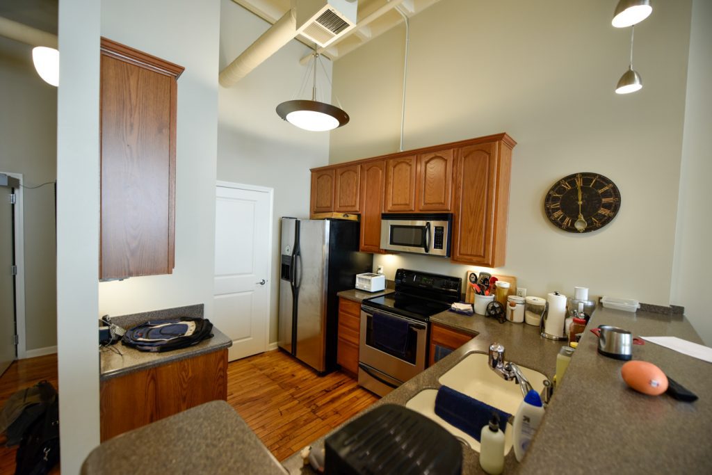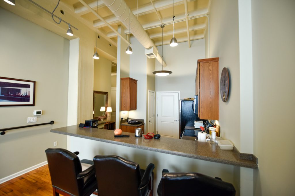 A recent ADA-compliant kitchen remodel included a demo of the existing light wood cabinetry, dreary countertops and outdated fixtures. A new wall framed the space, along with new plumbing and electrical fixtures. The original wood flooring remained in place.