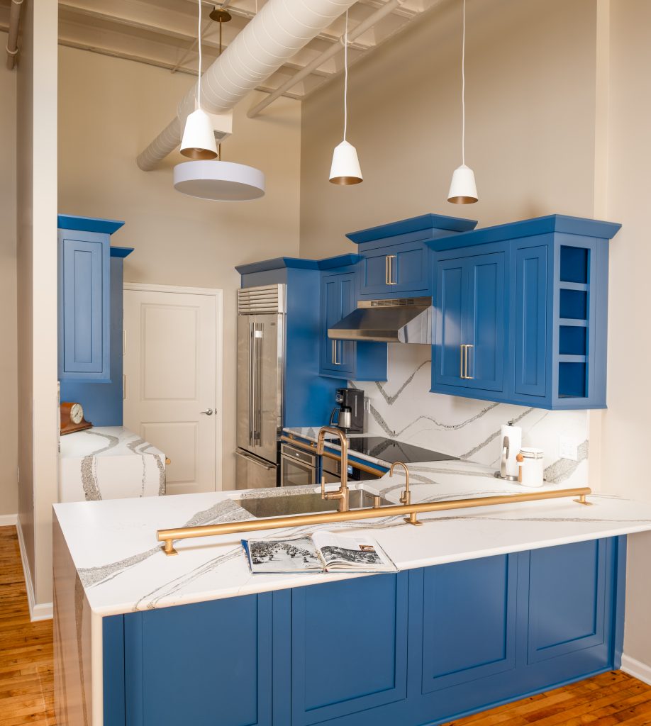 Just because a kitchen is safe and functional doesn’t mean it needs to be boring or basic. Colorful kitchen cabinets are a trendy way to add visual appeal. In this ADA-accessible kitchen, we chose new cabinetry and hardware designed by Adam Gibson. The cabinet paint color, PPG Chinese Porcelain Blue, gave the small space much-needed texture and visual interest.